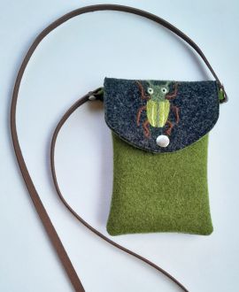 Pour répondre aux attentes de la clientèle masculine, j'ai confectionné une série de pochettes bicolores, aux tons neutres, avec un motif unique aiguilleté sur le rabat et une lanière cuir.
